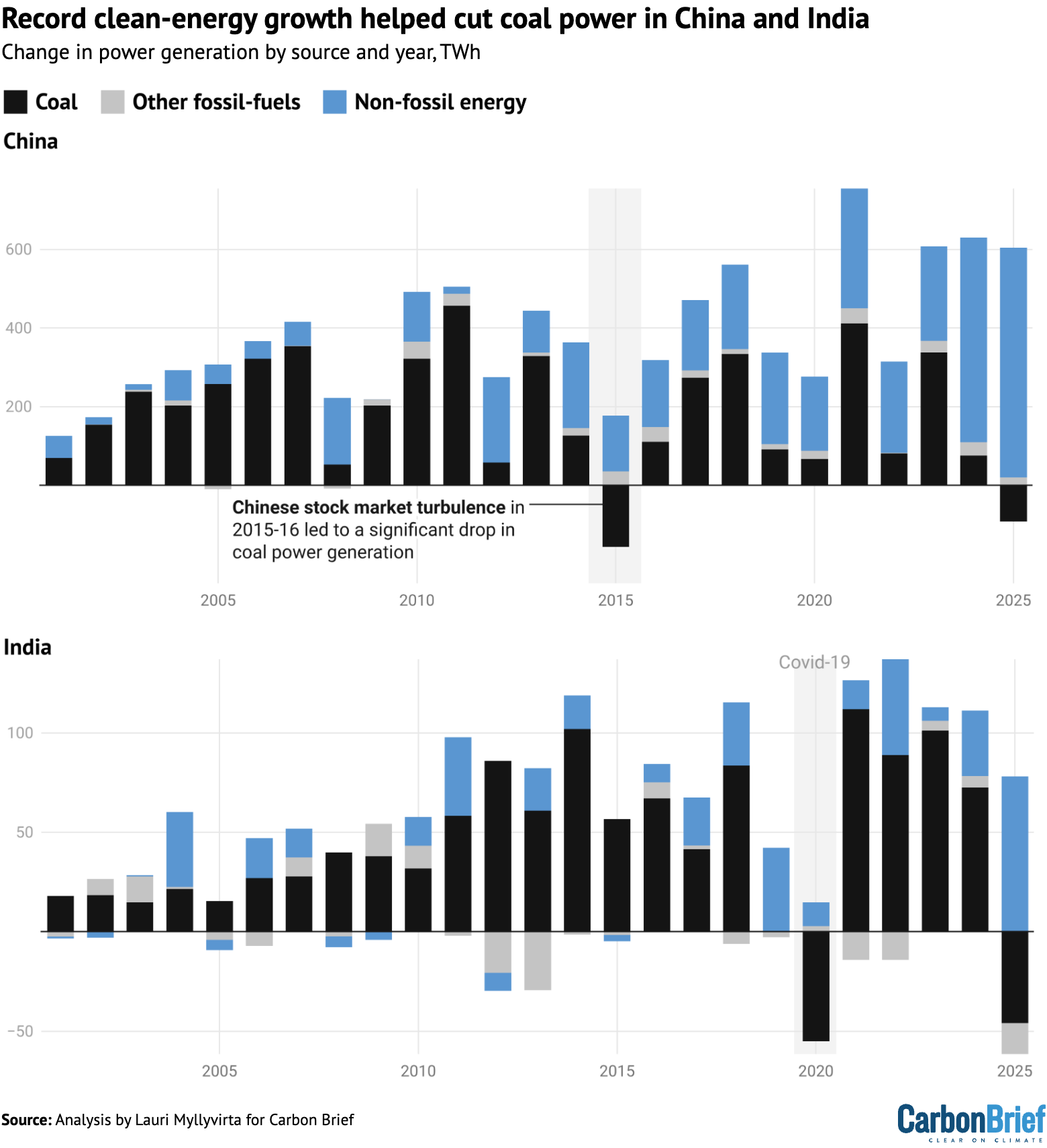 Change in power generation in China and India by source and year, terawatt hours 2000-2025. Source: Analysis by Lauri Myllyvirta for Carbon Brief. Further details below.