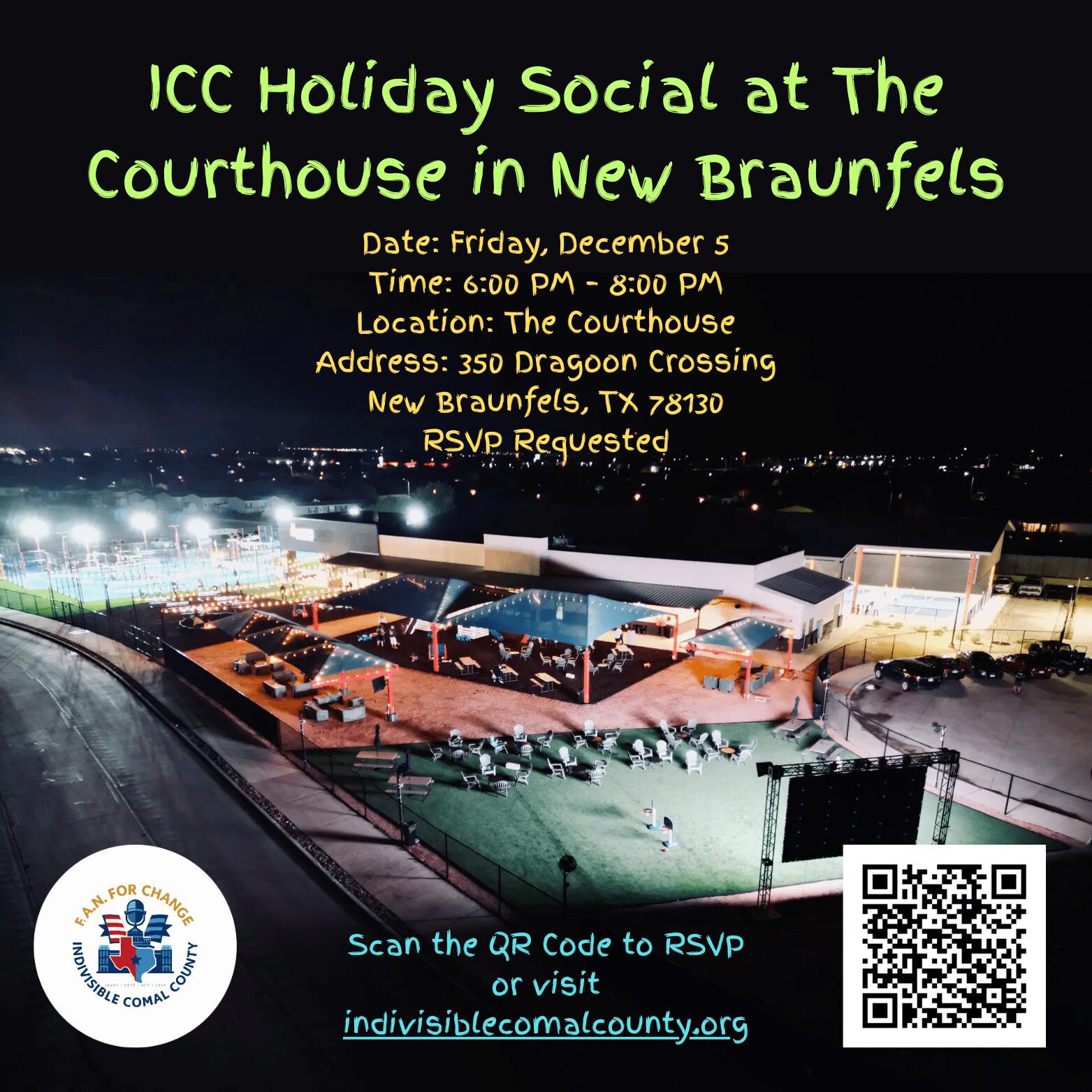 The Courthouse 350 Dragoon Crossing, New Braunfels, TX, United StatesJoin us for a relaxed ICC holiday social at The Courthouse to connect, meet the team, and build community together. #IndivisibleComalCounty #ComalCounty #NewBraunfels #Texas #ICC #FanForChange #CommunityPower #OrganizeNow