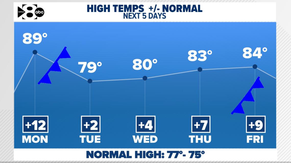 Monday will bring a big spike in the temperatures. Highs will soar back into the upper 80s Monday afternoon ahead of another cold front.