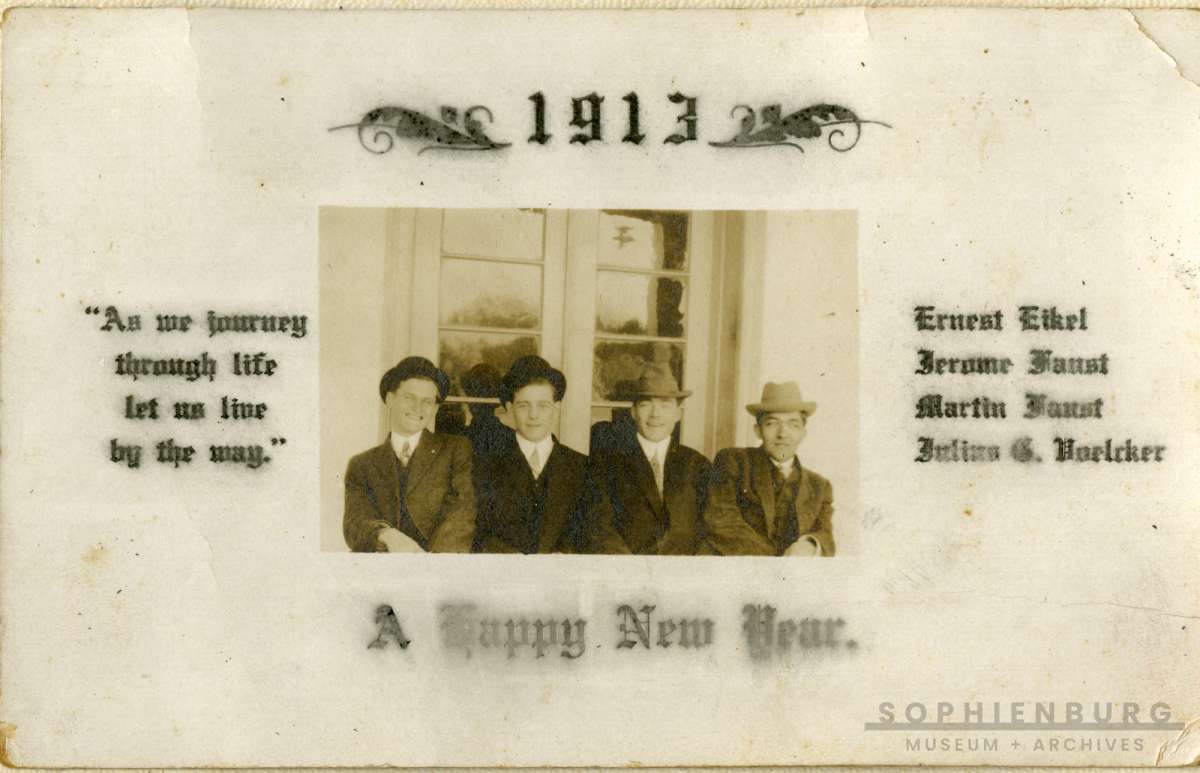 Erna Heidemeyer Rhode, born in 1896, was also a local lady who remembered this interesting custom. “I was thinking back on an activity which happened on New Year’s afternoon. A boyfriend, of course — by that time we were teenagers and we each had a boyfriend — would rent a buggy or surrey from the livery stable. There were no cars at that time; maybe one or two boys had them. They would bunch up in fours or fives or whatever amount they could get into the rental buggy and they would come to the different houses and call on the girls. Usually, two or three girls would go together and be at somebody’s house. [The boys] would stay for maybe an hour or so, and if the house had a piano and one of the girls could play the piano, then we’d sing and we’d have refreshments for the boys. They’d stay for about an hour and then they’d go back … I mean, they’d leave and would go back to somebody else’s house where they got the same courtesy and entertainment.”