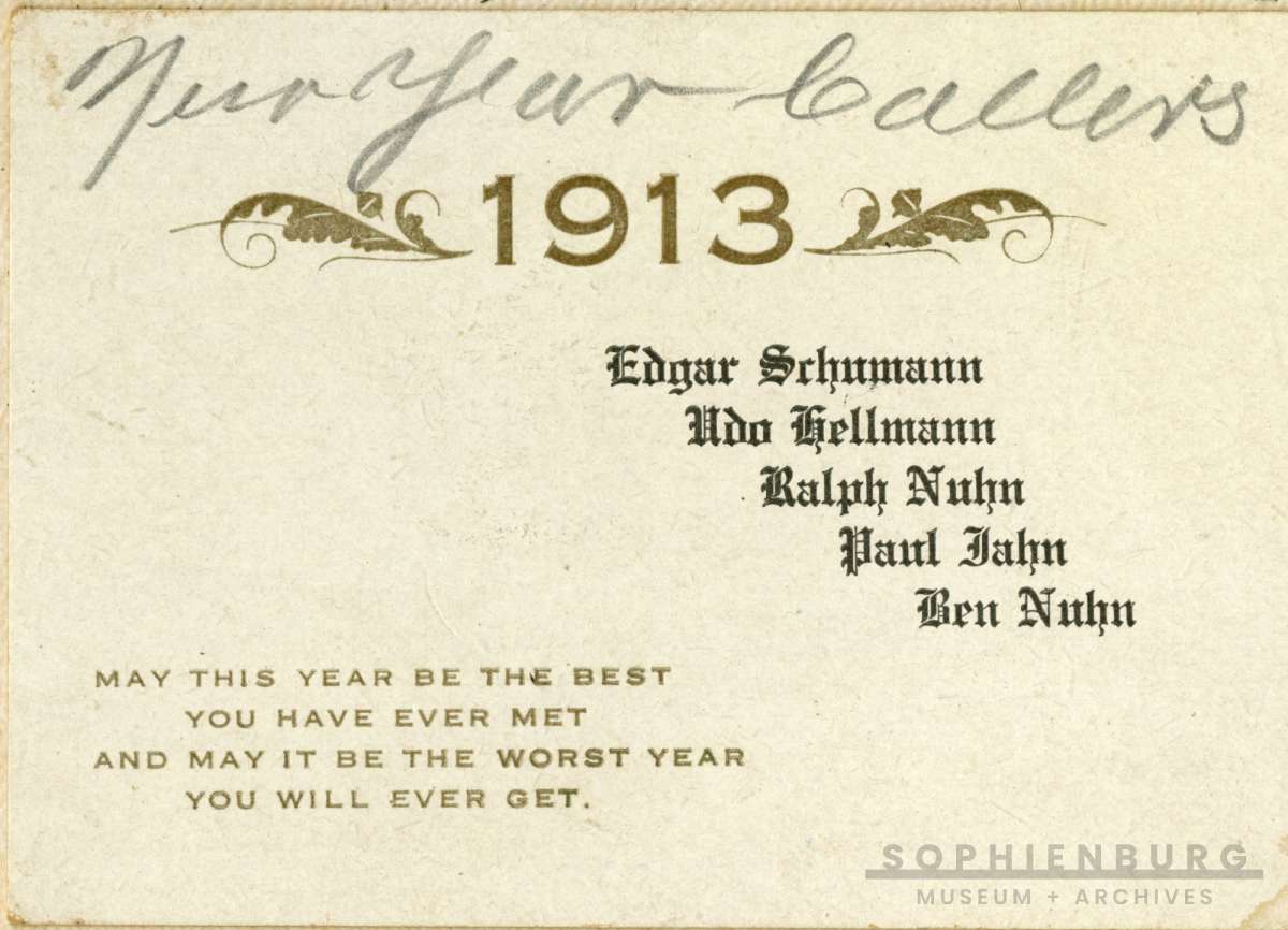Sources: Sophienburg Museum’s “Reflections” programs #8 and #202; https://friendsppm.wordpress.com/2019/12/09/the-long-lost-custom-of-new-years-day-calling/; https://nycpast.org/2016/12/29/calling-in-new-york-a-new-years-day-tradition/.