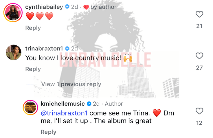 K. Michelle responded, “@trinabraxton1 Come see me Trina. Dm me, I’ll set it up. The album is great.”