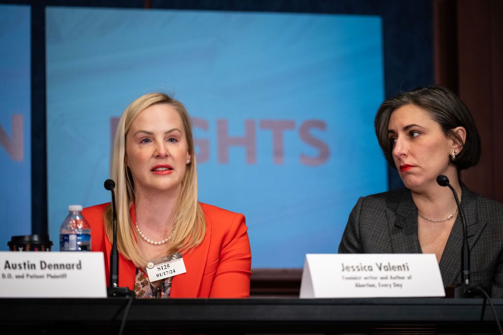 Dr. Austin Dennard, patient plaintiff in the Zurawski v. Texas case, and writer Jessica Valenti speak during a briefing about the state of abortion rights in America, at the U.S. Capitol January 17, 2024 in Washington, DC. (Photo by Drew Angerer/Getty Images)